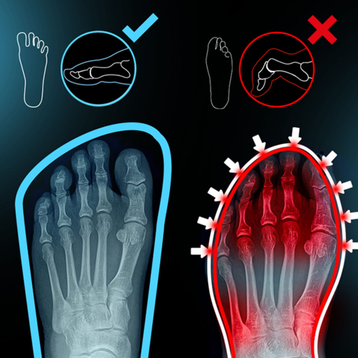 Problem vieler Marken: Viele Hersteller übernehmen die Form klassischer Schuhe mit spitz zulaufender Zehenbox – dadurch werden die Zehen eingequetscht.