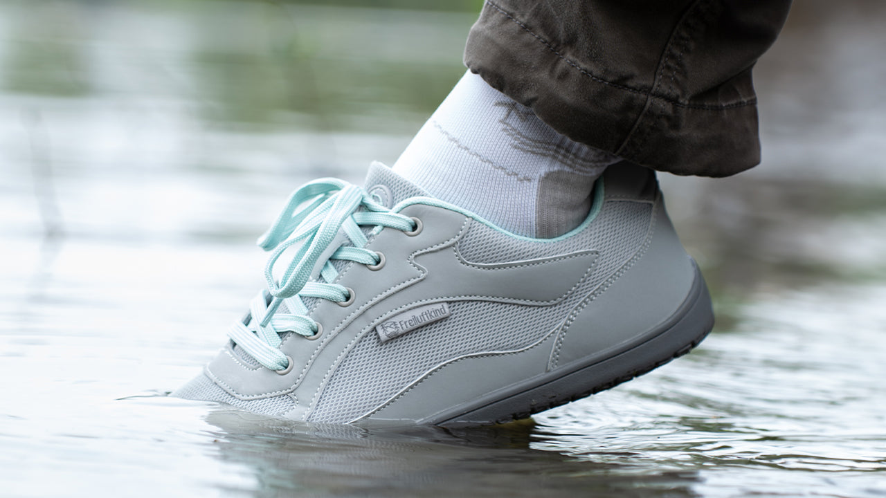 Ein guter Barfußschuh besteht aus atmungsaktiven Naturmaterialien oder High-Tech-Stoffen, die Feuchtigkeit regulieren, Schweiß vorbeugen und geruchsneutral bleiben.